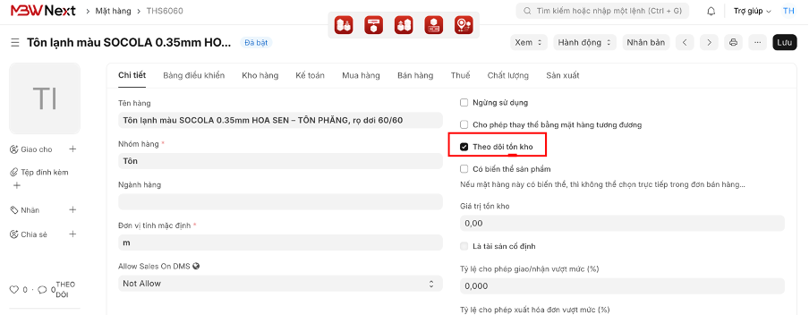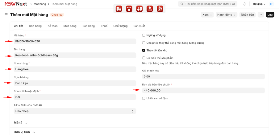 ● Với dịch vụ hoặc tài sản không nhập kho: Bỏ tích "Duy trì kho".