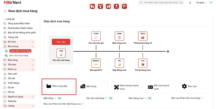 ● Nhà cung cấp: Hồ sơ thông tin đối tác, lịch sử giao dịch và công nợ.