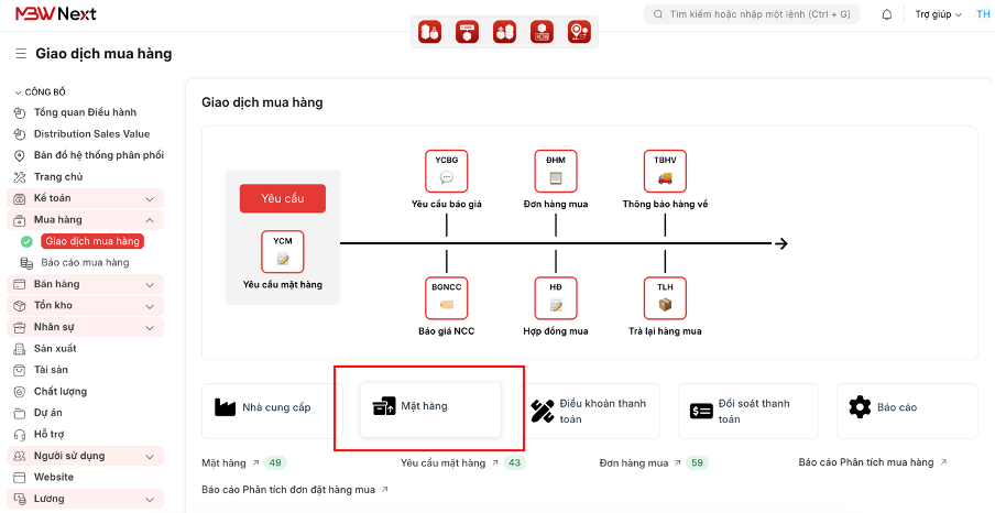 ● Mục đích: Định nghĩa hồ sơ chi tiết của các mặt hàng, nguyên liệu hoặc dịch vụ mà doanh nghiệp cần mua (Quy cách, đơn vị tính, mã vạch...).